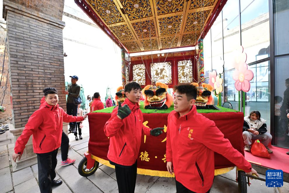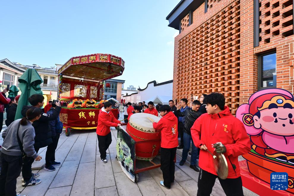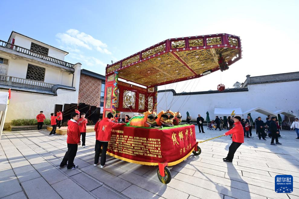 1月30日,在福州市上下杭历史文化街区,兴贤少年线狮队成员在表演后推着道具游街。新华社记者 姜克红 摄