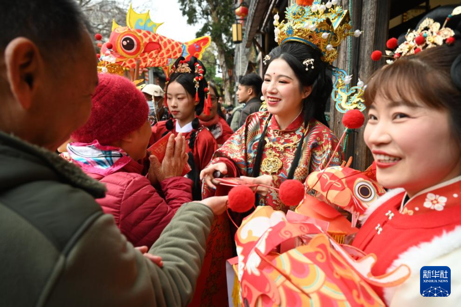 2月2日,“女财神”为福州三坊七巷的游客送上新年祝福。新华社记者 林善传 摄
