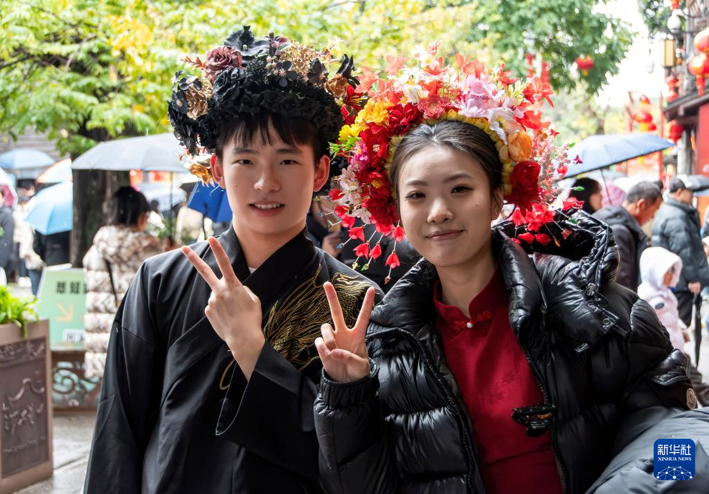 一名游客头戴“簪花”在福州市三坊七巷打卡留影(2月3日摄)。新华社记者 魏培全 摄
