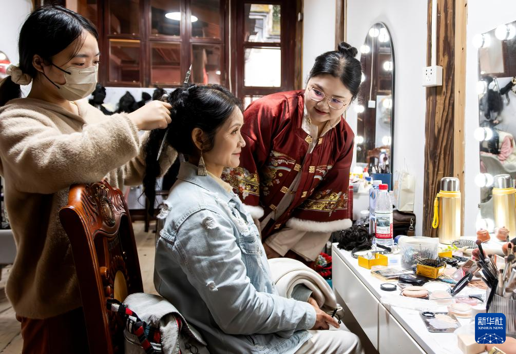 2月3日,在福州三坊七巷一处“三条簪”化妆跟拍点,化妆师在为来自上海的母女进行“三条簪”妆造。
