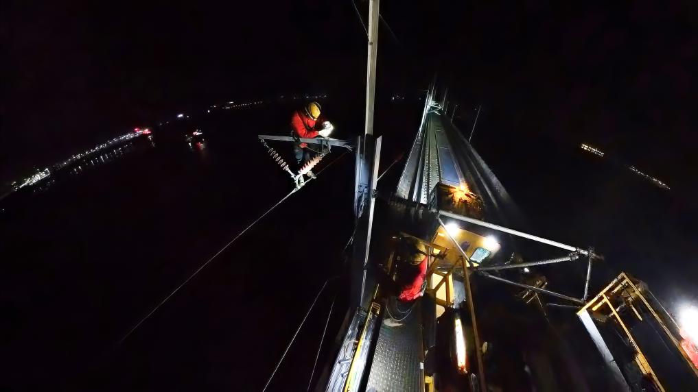 另外几名工人也紧跟着开始工作。他们绑着安全绳,悬在海上高空,在接触网之间灵活穿行,如同“海上蜘蛛侠”。他们脚底,是漆黑一片的大海。