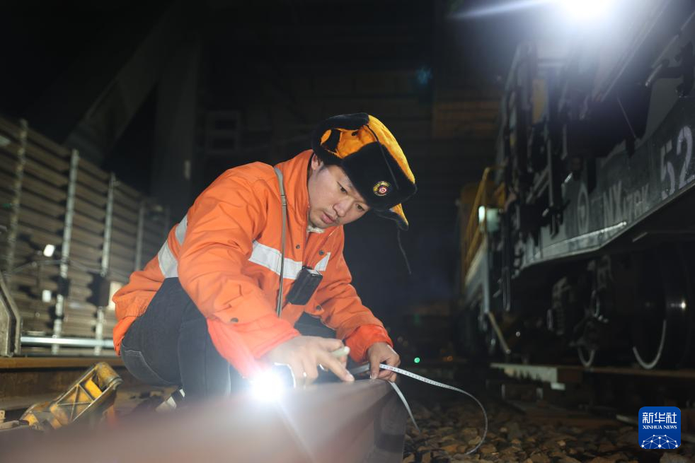 施工负责人陆琦正在标记钢轨更换区段。新华社发(易威 摄)