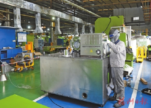 在福州六和机械有限公司生产车间,员工们在流水线上各司其职,呈现出一派热火朝天的生产景象。