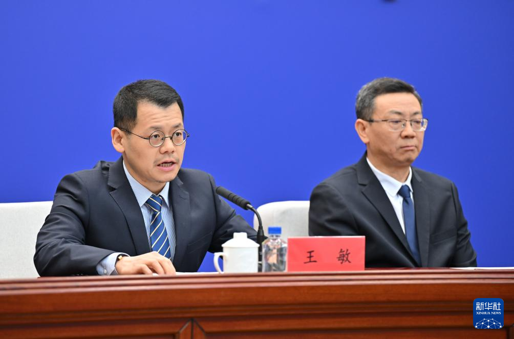 2月13日,中国科学院古脊椎动物与古人类研究所研究员王敏(左)在发布会上介绍“政和八闽鸟”相关情况。新华社记者 姜克红 摄