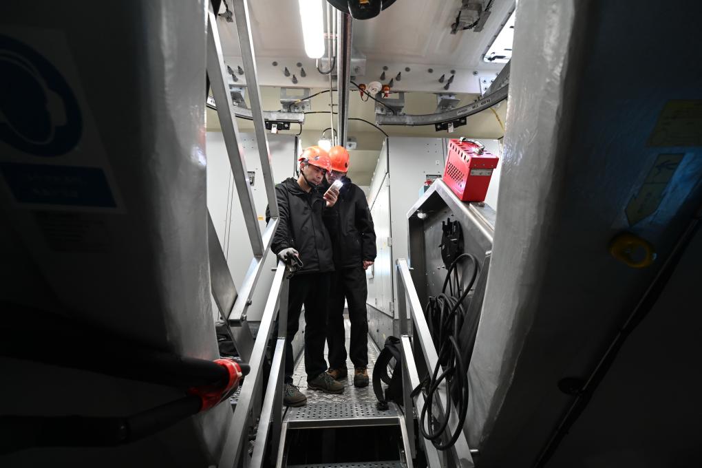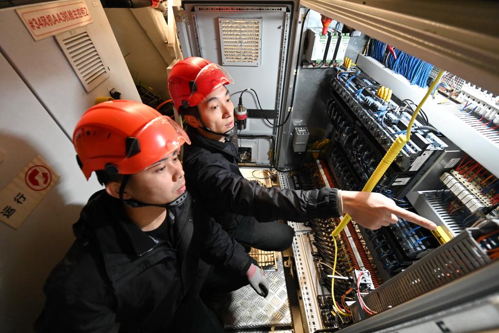 1月19日,黄志明(右)和同事在风机机舱内进行故障处理。