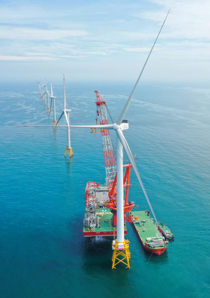 福建北部海域全球首台16兆瓦海上风电机组吊装完成现场(2023年6月28日摄)。