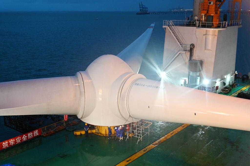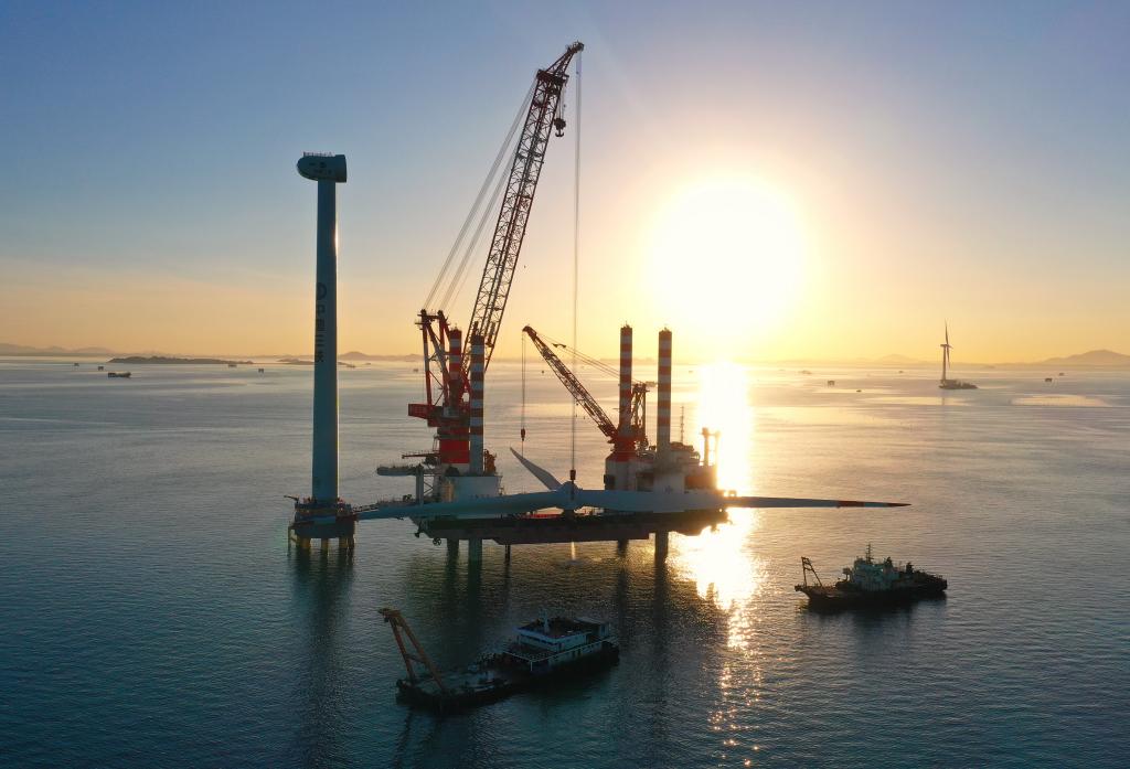 这是在三峡集团福建福清兴化湾二期海上风电场的10兆瓦风机叶片开始起吊(2020年6月13日摄)。