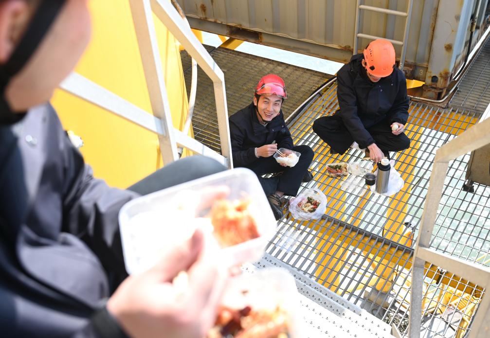 1月19日,黄志明(中)和同事在海上风电塔基上吃着从岸上带来的午餐。