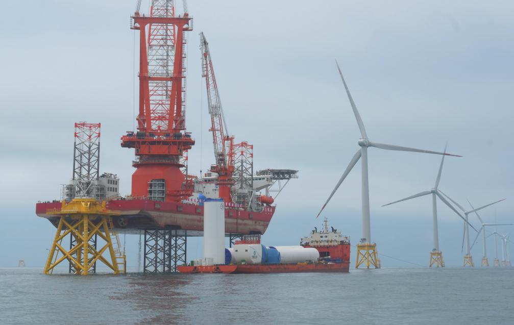 这是在福建北部海域16兆瓦超大容量海上风电机组塔筒吊装现场(2023年6月24日摄)。