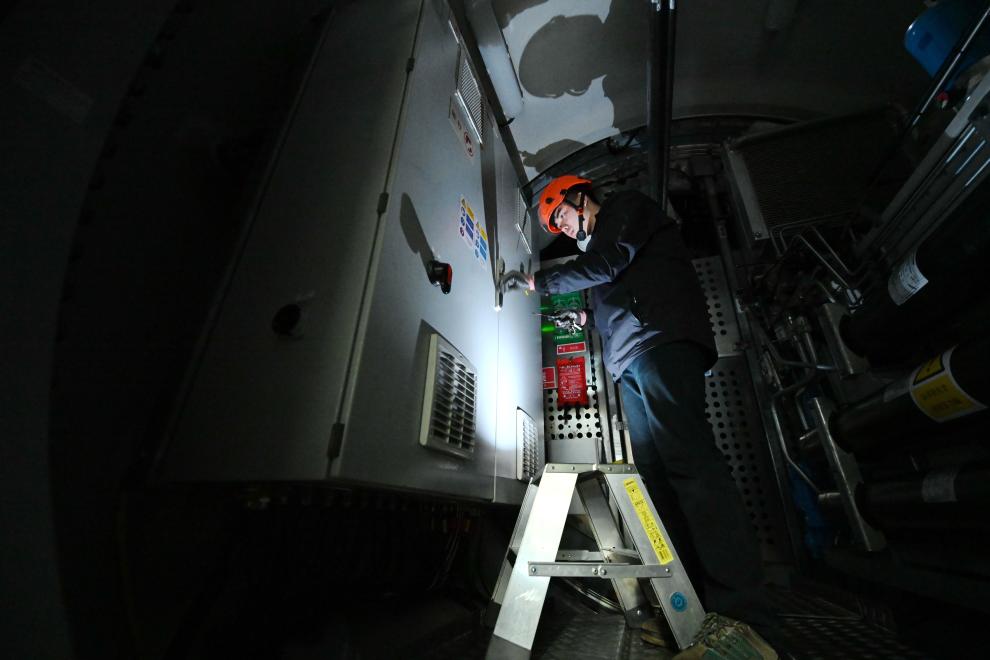 1月19日,郑桂雄在风机机舱内查找故障原因。