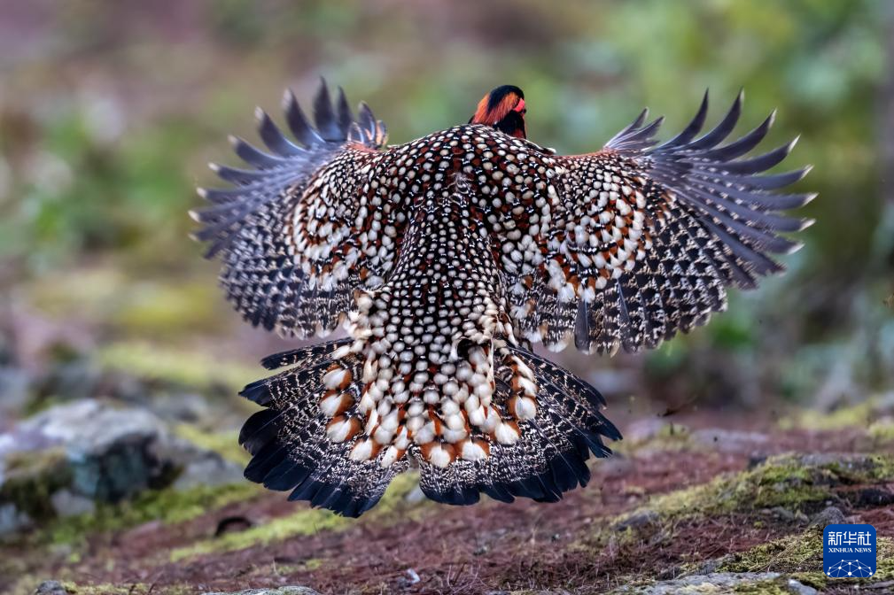 雄鸟“咕咕咕”地向林间发出约会信号后,一只黄腹角雉雌鸟随即出现。雄鸟快速贴近雌鸟,展开尾羽,拍打翅膀,双脚交替踩踏,跳起了舞蹈,嘴里发出轻微的鸣叫,身体同时开始抖动。