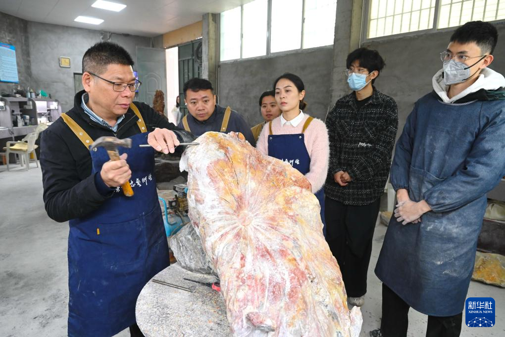 3月5日,中国工艺美术大师陈礼忠(左一)在给学生示范寿山石雕刻技法。新华社记者 林善传 摄