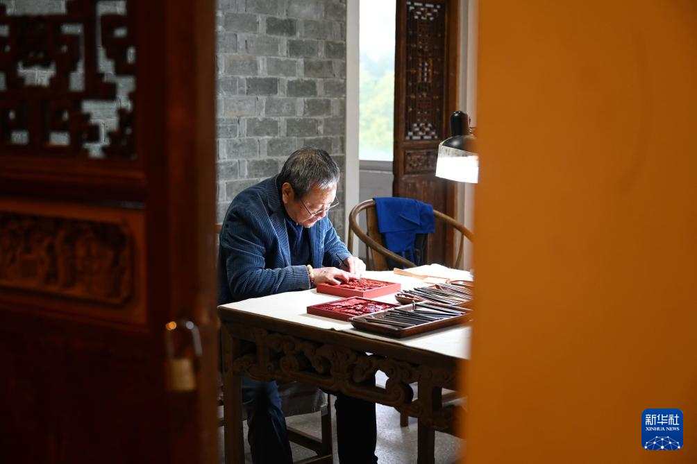 3月4日,中国工艺美术大师袁师永在进行雕漆创作。新华社记者 林善传 摄