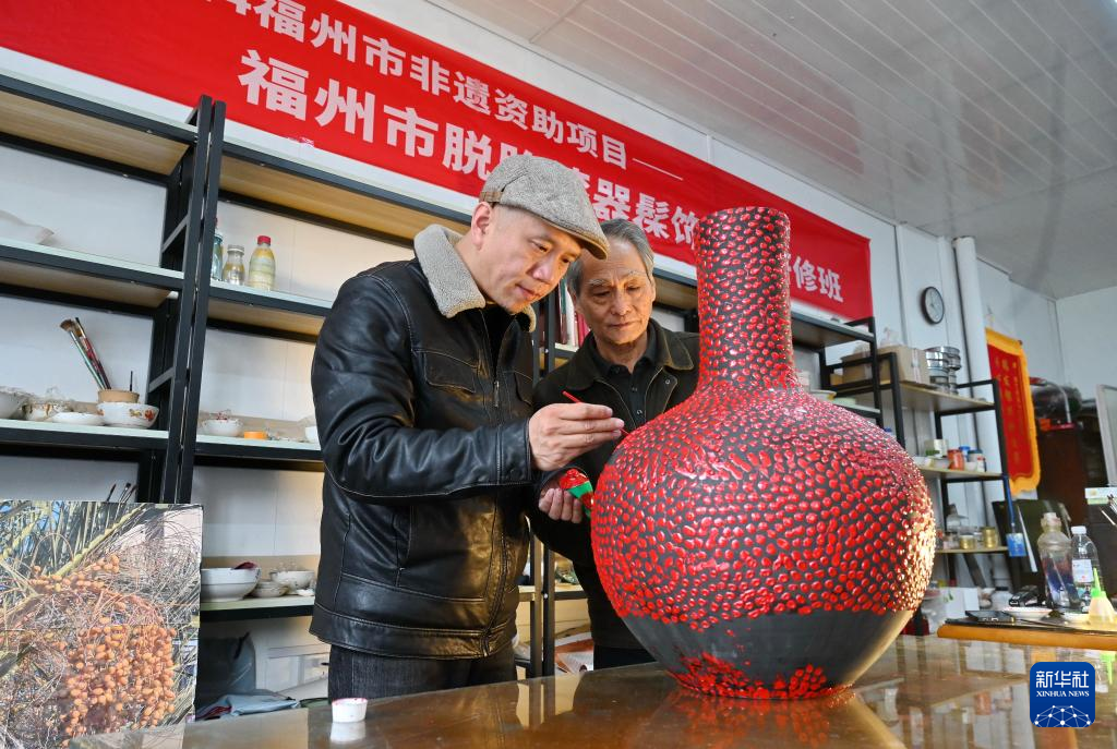 3月6日,福建省工艺美术大师陈天灨(右)在指导学生进行漆器髹饰技法。新华社记者 林善传 摄