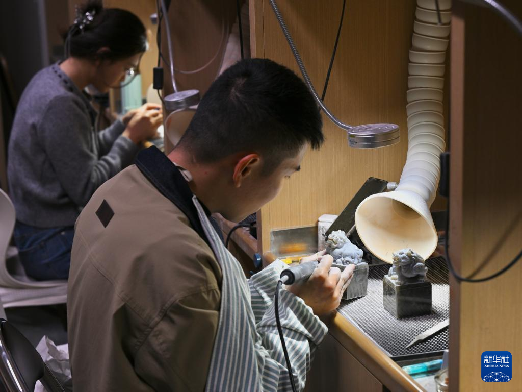 3月6日,在福建省工艺美术大楼寿山石雕刻工作间,两名青年雕刻师在雕刻寿山石。新华社记者 姜克红 摄