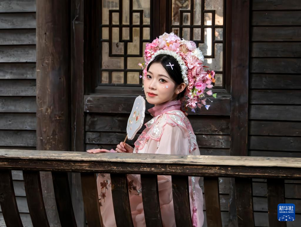 一名游客头戴“簪花”在福州市千年古街三坊七巷里打卡留影(2月3日摄)。新华社记者 魏培全 摄