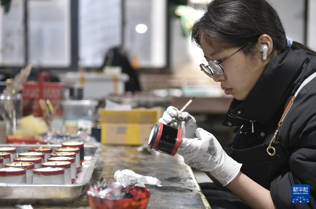 3月6日,在福州漆研堂文化传播有限公司生产车间,工作人员在制作漆艺茶具产品。新华社记者 鲁鹏 摄