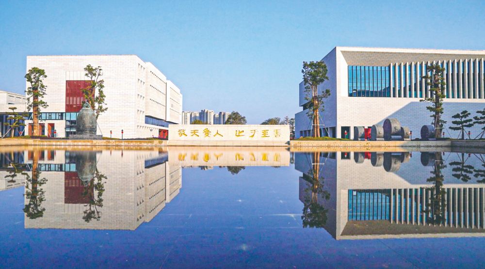 学校四面环水,占地约千亩。沿学校中轴线望去,位于正中的图书馆形似一顶博士帽,气势磅礴,两侧分布着旗山楼、鼓山楼、笔架山楼等教学行政楼,以福州地理标志命名,彰显地域特色。中轴线上矗立着“敬天爱人 止于至善”的校训,表达了对未来学子寄予的厚望。