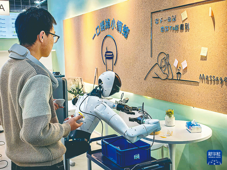 在智元新创技术有限公司数采中心,数据采集员“教”机器人擦桌子。新华社记者龚雯 摄