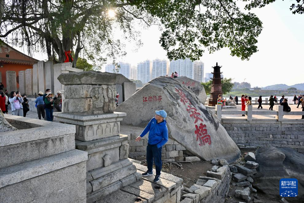 3月18日,洛阳桥上的游客在观看船形桥墩。新华社记者 姜克红 摄