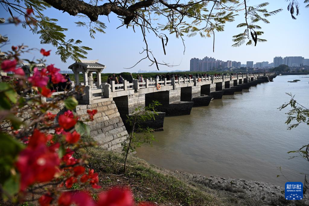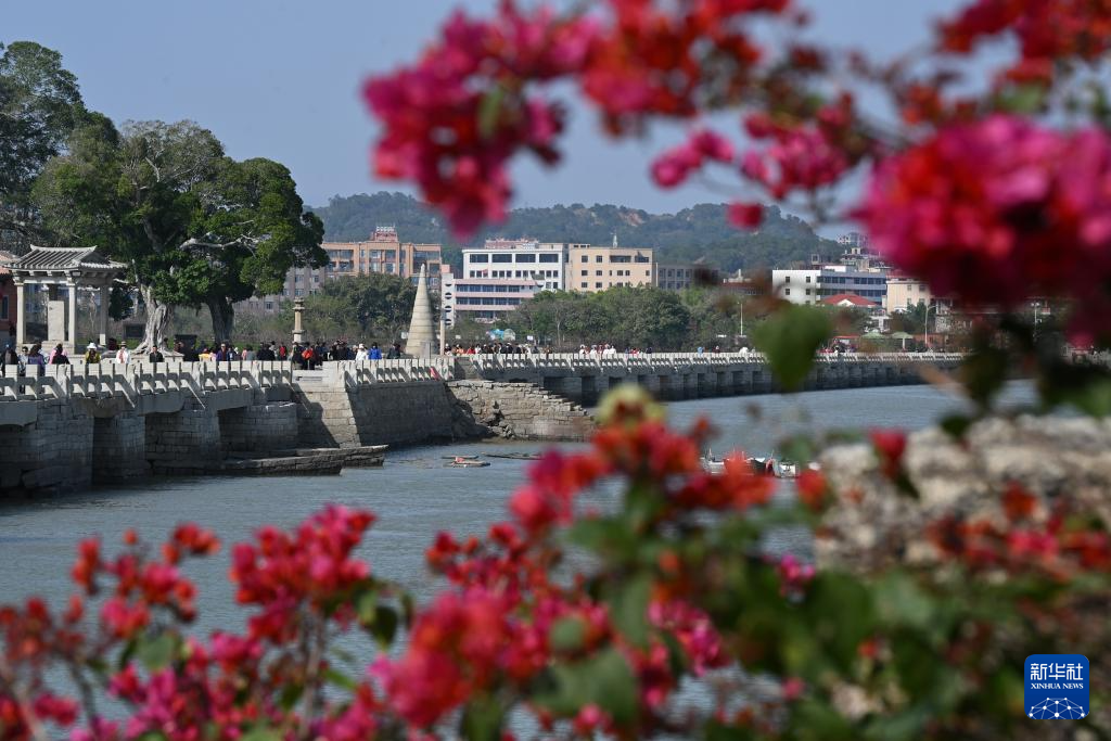 3月18日拍摄的红花掩映下的洛阳桥。新华社记者 姜克红 摄