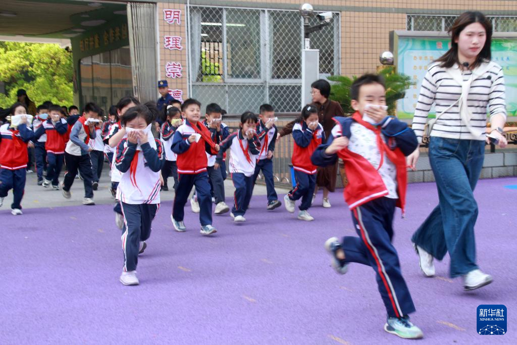 3月27日,福建省南平市顺昌县实验小学联合顺昌县消防救援大队,开展消防安全教育进校园活动。这是师生们演练用湿毛巾捂住口鼻从火场逃生。