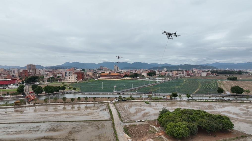 这是4月1日在福建南安拍摄的无人机吊运物资的画面(无人机照片)。新华社记者 周义 摄