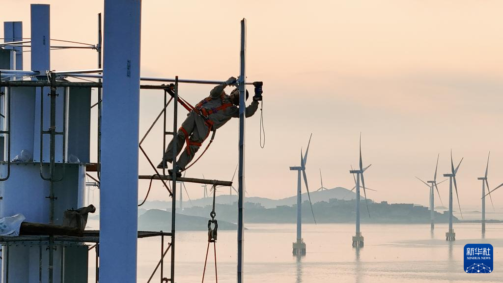 施工人员在赤山岛周围海域安装海上风机叶片。柳烨 摄