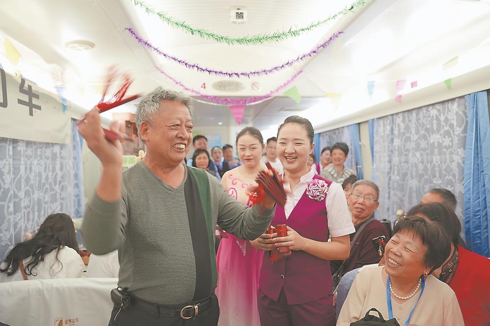银发旅游专列上,乘务人员与游客联欢。