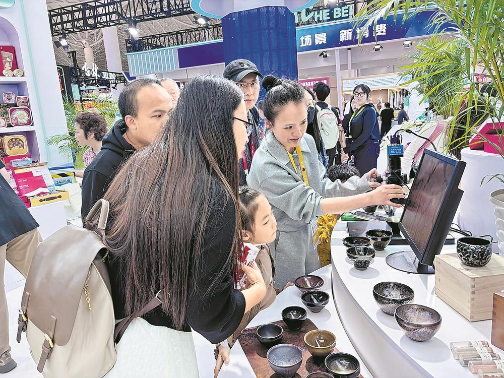 与莆田鞋同步亮相的,还有德化陶瓷及南平建盏两大区域公用品牌。千年窑火,德化传承。本届消博会上,德化县韵丽陶瓷有限公司携诸多“国礼级”制品而来,作品《一路祥和》以青山为基、祥云为路、荷花为伴,色彩明丽、晶莹通透,让人感知匠心雕琢的吉祥意象;胎质古朴厚重、釉彩恰似星空,南平建盏一展非遗芳华。南平市建阳区水木间建盏陶瓷有限公司更是将高清显微镜带到了消博会现场,让观展人洞见巧夺天工的细致纹理。