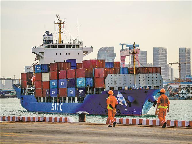 集装箱船舶昨日靠泊海天码头,运送海铁联运的汽车配件前往越南。(记者 卢剑豪 摄)
