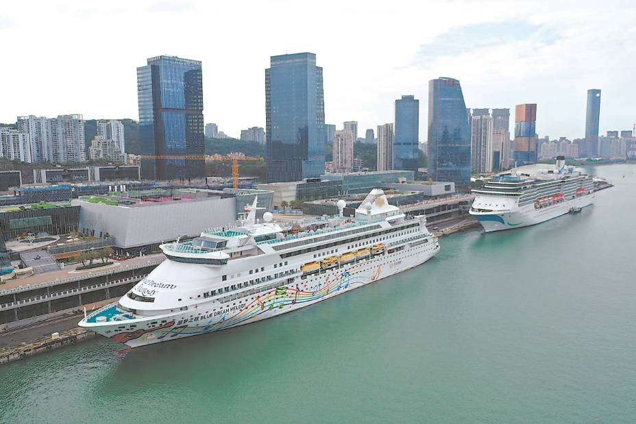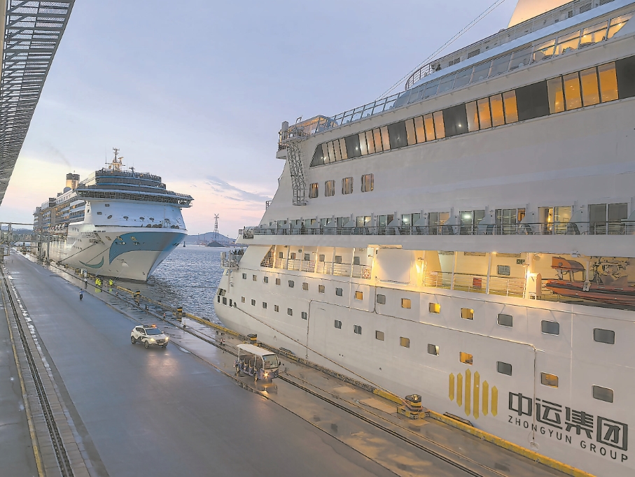 “蓝梦之歌”号邮轮(左)与“爱达·地中海号”邮轮停靠在厦门国际邮轮中心。 (高崎边检供图)