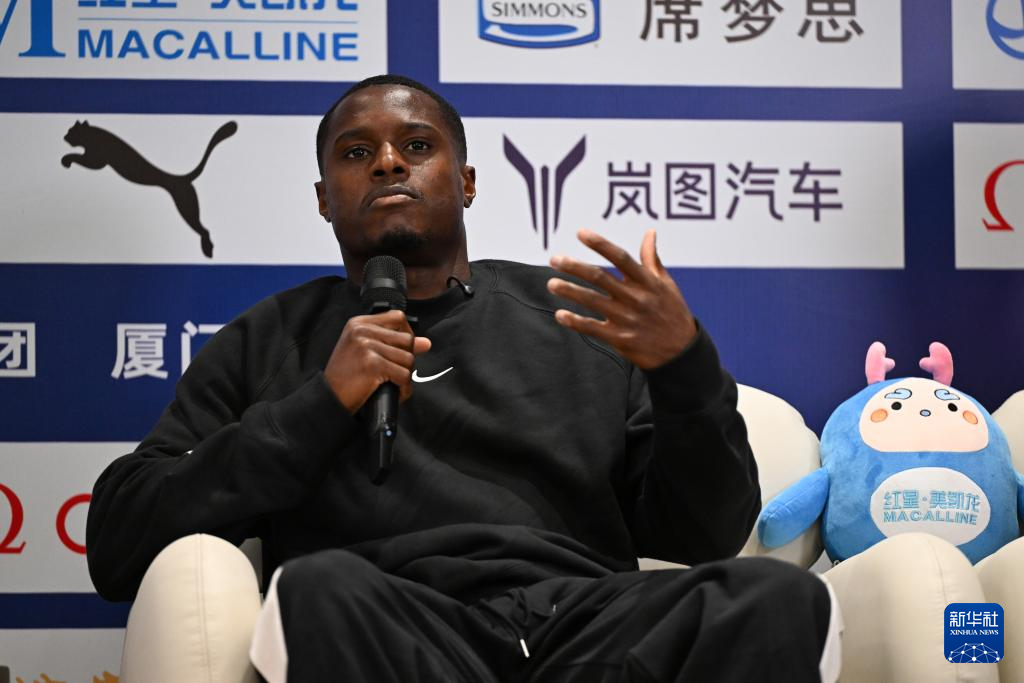 4月25日,美国短跑运动员科尔曼在新闻发布会上。新华社记者 宋彦桦 摄