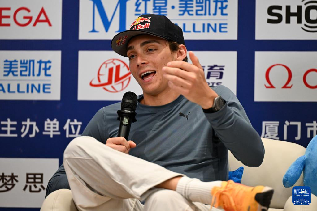 4月25日,瑞典撑杆跳高运动员杜普兰蒂斯在新闻发布会上。新华社记者 宋彦桦 摄