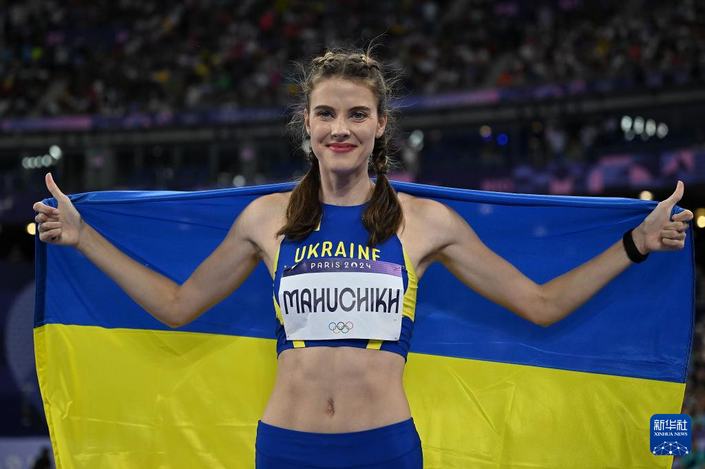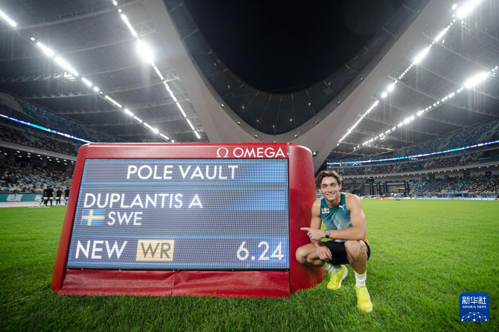 2024年4月20日,瑞典选手杜普兰蒂斯在赛后与显示新世界纪录的记分牌合影。新华社记者 江汉 摄