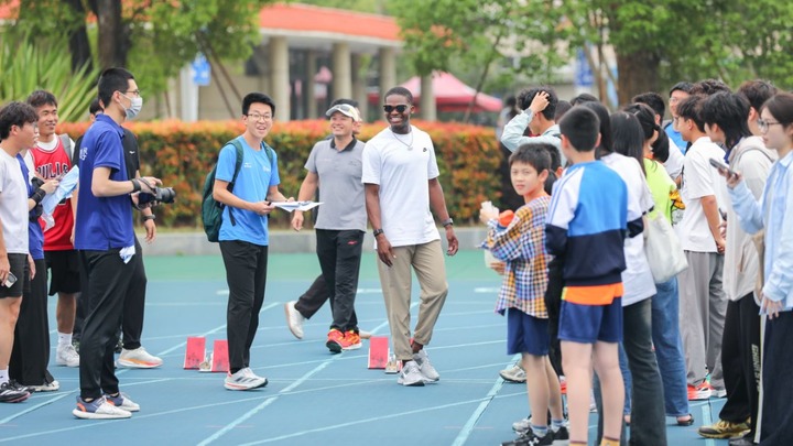 4月24日,美国运动员克里斯托弗·贝利在厦门大学演武运动场,指导学生们体验田径项目。