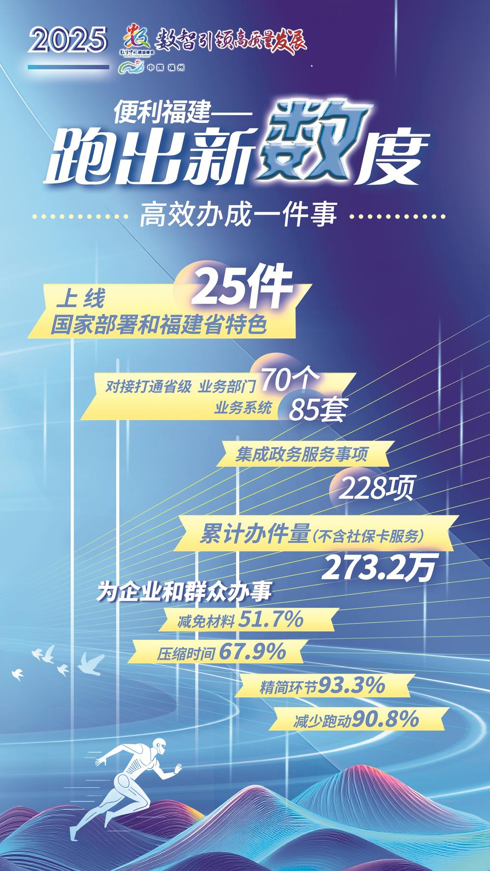 企业信息变更“一件事”采用告知承诺模式,取消收取企业印章变更的相关材料;残疾人服务“一件事”,通过“一人一档”数据核验分析,实现城镇居民基本养老保险补助“免申即享”、直接发放……目前,新版闽政通已上线国家部署和福建省特色共计25件“高效办成一件事”,累计办件量达273.2万(不含社保卡服务),为企业和群众办事减免材料51.7%,压缩时间67.9%,精简环节93.3%,减少跑动90.8%。