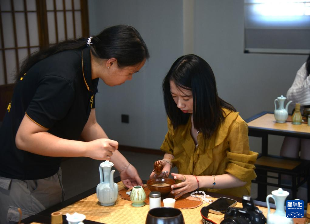 游客在茶艺师指导下学习点茶。新华社记者 李昊泽 摄