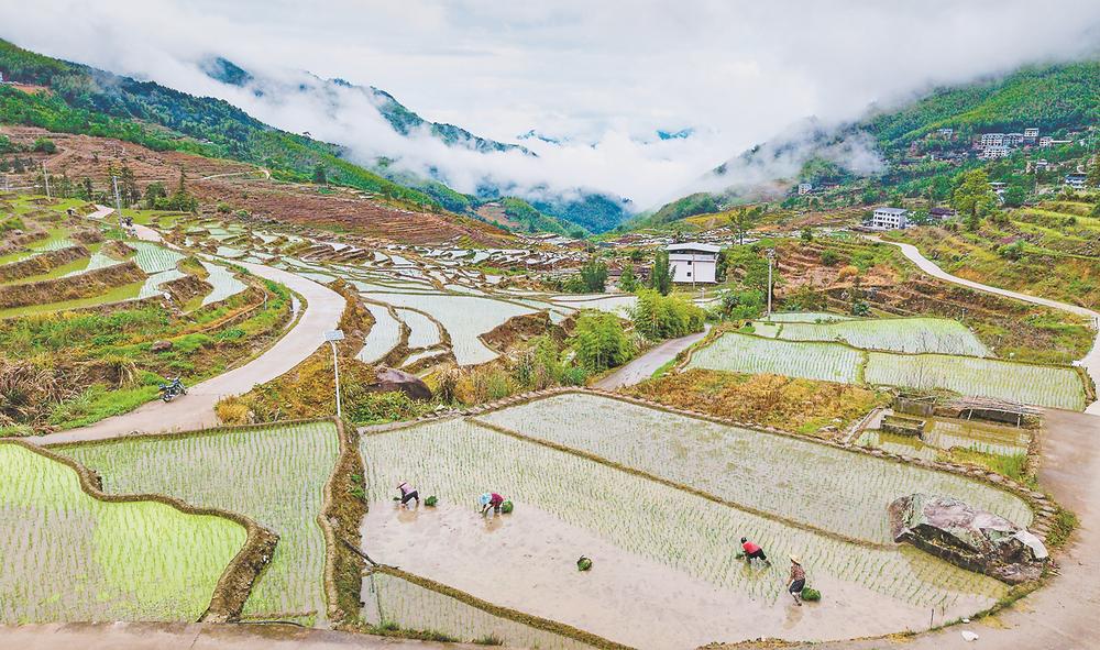 近日,福建尤溪联合梯田进入插秧农忙时节。层层梯田波光粼粼,梯田水面如镜,农户抢抓农时引水整田、栽插秧苗,构成一幅生动的农耕画卷。作为三明市尤溪县重要农业文化遗产,联合梯田通过传统耕作方式延续千年智慧,推动生态农业与文旅融合,助力乡村振兴,展现人与自然和谐共生的美景。(丁天霖 摄影报道)