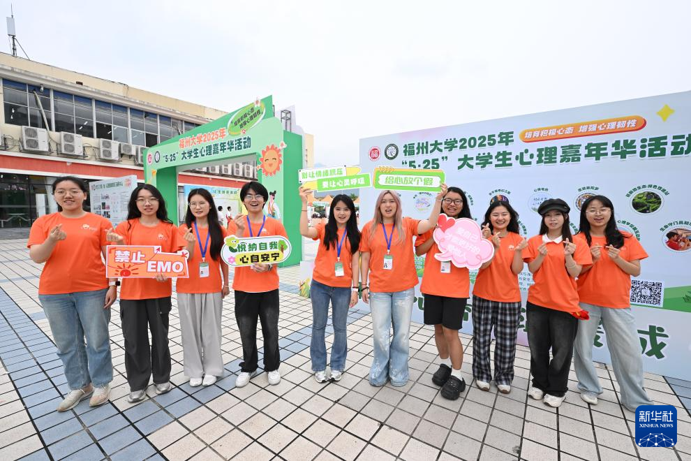 5月25日,在福州大学心理嘉年华活动上,福州大学“小福心”心理健康服务社团成员展示心理健康宣传标牌。新华社记者 姜克红 摄