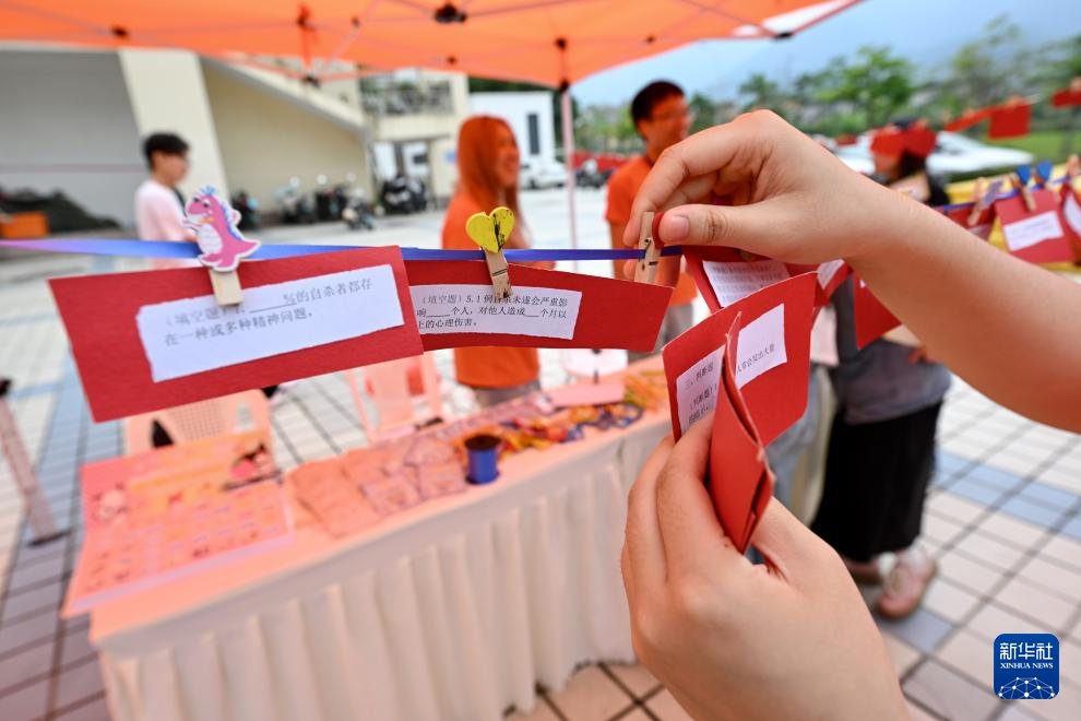 5月25日,在福州大学心理嘉年华活动上,一名同学在悬挂心理健康知识问答题卡。新华社记者 姜克红 摄