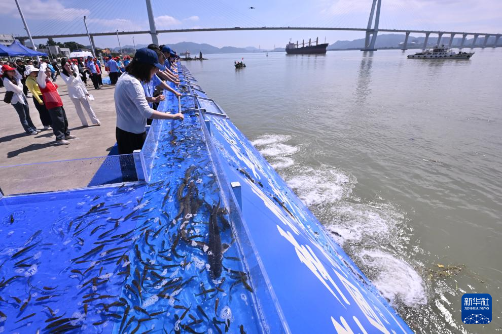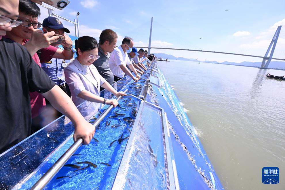 6月6日,在福建省福州市闽江入海口举行的全国水生生物同步增殖放流主会场活动中,嘉宾在投放鱼苗。新华社记者 姜克红 摄