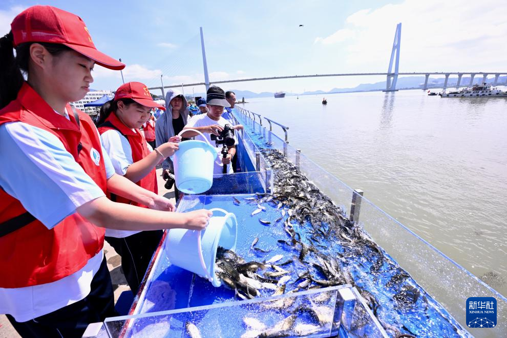 6月6日,在福建省福州市闽江入海口举行的全国水生生物同步增殖放流主会场活动中,志愿者将鱼苗转移至放流槽。新华社记者 姜克红 摄