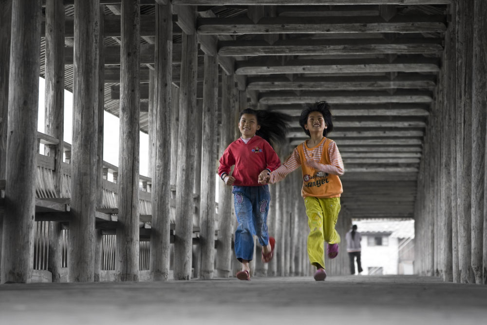 孩子们在廊桥上玩耍 卓育兴 摄
