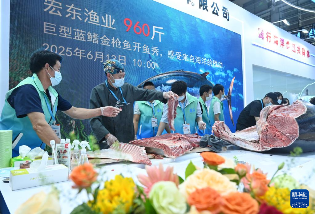 6月13日,参展商在第十七届中国(福州)国际渔业博览会上处理金枪鱼。新华社记者 林善传 摄