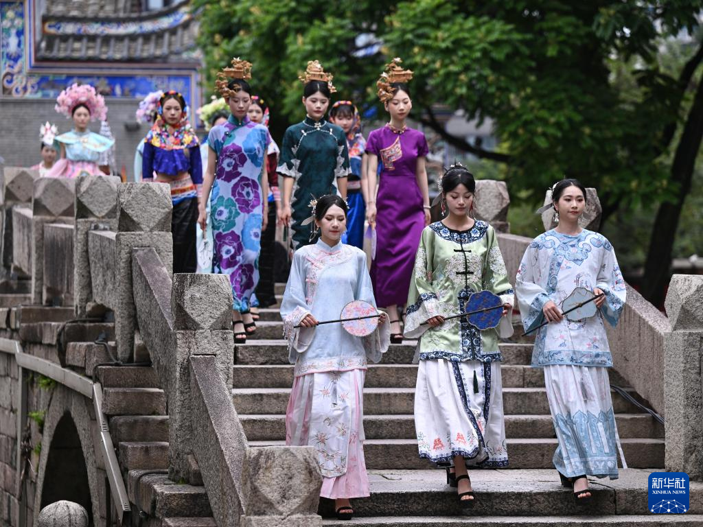 6月14日,模特在福建非遗主会场活动中展示福州“三条簪”、泉州“簪花围”等传统发饰。新华社记者 姜克红 摄