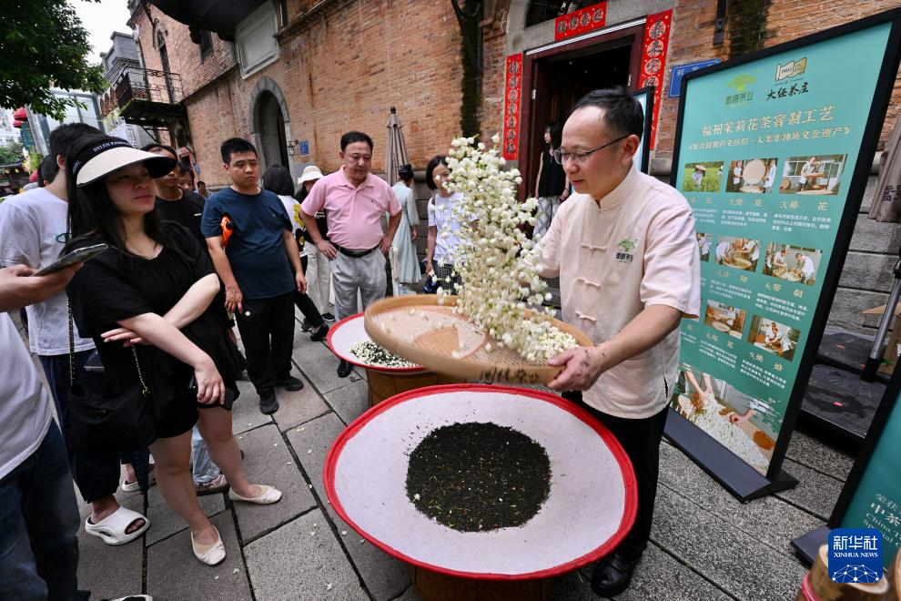 6月14日,非遗传承人(右一)在福建非遗主会场活动中展示福州茉莉花茶窨制技艺。新华社记者 姜克红 摄