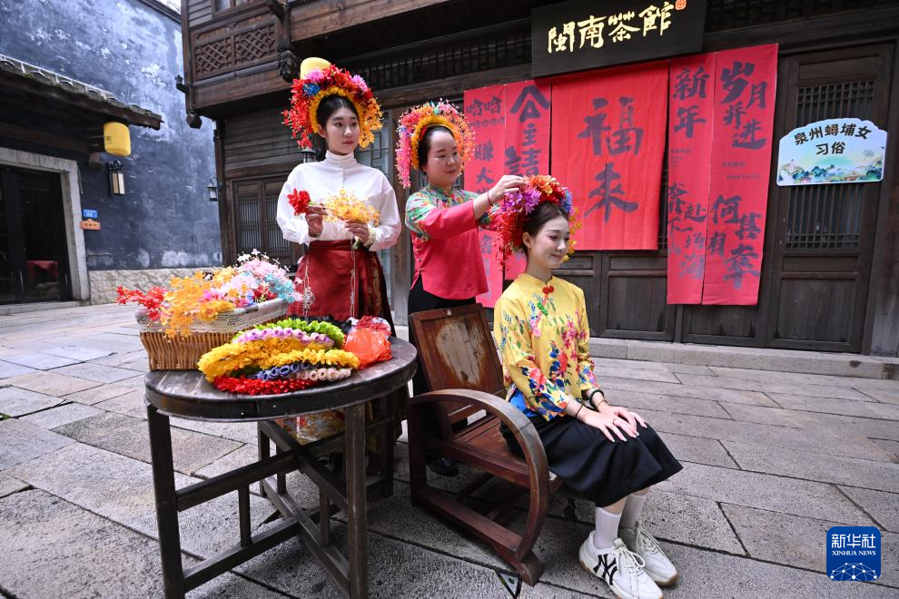 6月14日,非遗传承人黄丽泳(中)在福建非遗主会场活动中展示泉州蟳埔女“簪花围”发饰。新华社记者 姜克红 摄