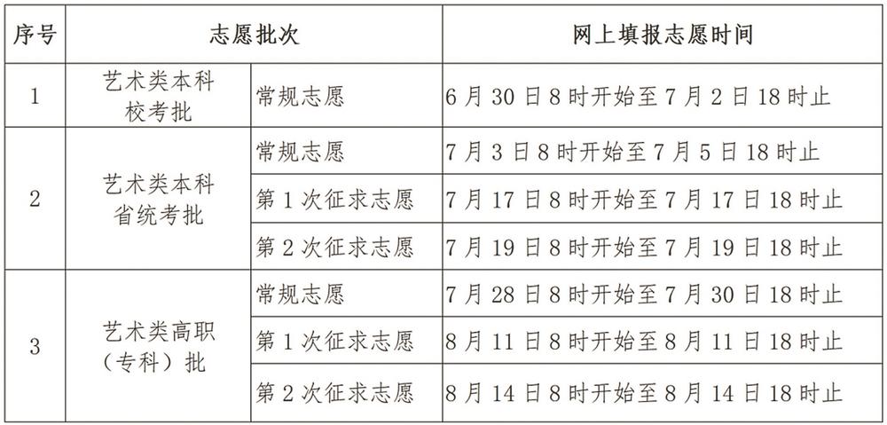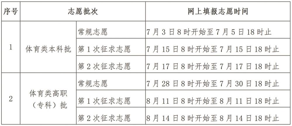 在录取批次及志愿设置上,普通类设本科提前批、本科批、高职(专科)提前批和高职(专科)批4个批次,艺术类设本科校考批、本科省统考批和高职(专科)批3个批次,体育类设本科批和高职(专科)批两个批次。