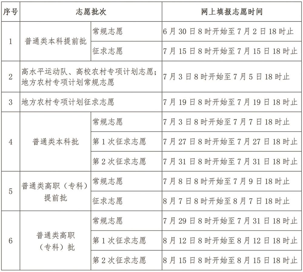 网上填报志愿时间具体如下列表格: